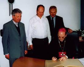 Auf Einladung des Villmarer Bürgermeister Hermann Hepp begaben sich der Weihbischof sowie Pater Karl Brahm (Bildmitte) ins Villmarer Rathaus. In einer kleinen Feierstunde beglückwünschte der Bürgermeister namens der Gemeinde den hohen Gast zu seinem neuen Amt und wünschte beiden Geistlichen Gesundheit für ihre verantwortungsvollen Aufgaben. Er verwies auch auf die Geschichte Villmars und die Verbindung zur Trierer Benediktiner-Abtei St. Matthias seit der Schenkung durch Kaiser Heinrich III. vor 950 Jahren hin. Die Ehrengäste Weihbischof Robert Brahm und Pater Karl Brahm trugen sich in das Goldene Buch der Gemeinde ein.