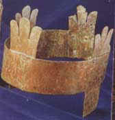 eine aus vergoldetem Kupferblech bestehende Krone, sowie ein von Leder