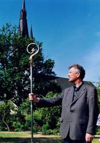 Diesem Vertrag unterzeichneten: für die Gemeinde Villmar, Bürgermeister Hermann Hepp und Erster Beigeordneter Günter Zanner, für die katholische Kirchengemeinde der amtierende Dekan Günter Daum sowie der Vorsitzende des Villmarer Pfarr-Verwaltungsrates Wolfgang Friedrich am 26.Oktober 2004 zu. „Ein denkwürdiger Tag, der in die Geschichte eingehen wird“ meinte Pfarrer Günter Daum. Der Vertrag sieht letztlich als Ablösungssumme der Gemeinde zur Baulast für den Villmarer Kirchturm einen Betrag von insgesamt 66.466.22 Euro vor. (Foto: Dekan Günter Daum mit Abtstab)Übrigens. Die Pfarrkirche St. Peter & Paul erhielt inzwischen den zweiten Turm, denn in der Nacht vom 12. auf den 13. August 1884 schlug mit entsetzlichem Schlage der Blitz in den ersten schönen Turm, der wie eine Fackel verbrannte. Unter der Amtszeit von Bürgermeister Johann Laux wurde der heutige Turm am 10.Juli 1885 im Beisein der Einwohnerschaft feierlich von Pfarrer Johannes Ibach geweiht. Stefan Schuh, Mitarbeiter des Vermessungsbüros Schneider, Limburg, stellte 2003 mit einem modernen Messgerät die genaue Höhe das Turmes von der Oberkante des Kirchenfußbodens bis zum höchsten Punkt des Wetterhahnes mit 59,29 Metern fest. Bleibt zu hoffen, das Kirche und Turm auch für die kommenden Generationen unseres Marktfleckens als Wahrzeichen dominiert. |