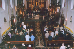 Frage: Warum feiern wir Kirmes? „weil es Tradition in Villmar ist“ so die Antworten vieler Jugendlichen und Zeitgenossen, die es nicht besser wissen oder vergessen haben, dass diese Tradition der Weihe der in den Jahren 1746 bis 1749 fertig gestellten neuen Pfarrkirche St. Peter und Paul ihren Ursprung hat. Diese Kirchweihe, im Volksmund „Kermes“ genannt, feierten die Villmarer jetzt zum 257. Mal. ( Foto:2004 Festmesse mit Weihbischof Robert